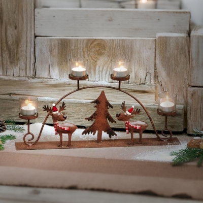 Le bougeoir de Noël en métal évoque la convivialité des fêtes à travers une silhouette entièrement façonnée en forme de rennes et de sapin. Son design en arche, réalisé en fer patiné brun, crée un décor chaleureux et rustique qui rappelle les ambiances de chalet en hiver. Placé sur une table, une cheminée ou un rebord de fenêtre, il attire le regard par sa présence artisanale et festive.