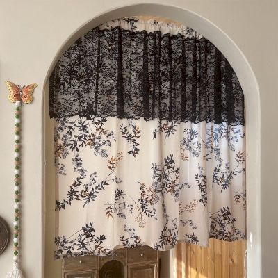 Rideau Brise-Bise Bleu Foncé à Feuilles avec Dentelle Noire