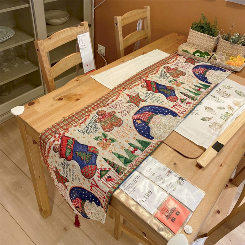 Le chemin de table de Noël évoque la douceur des veillées d’hiver. Les motifs racontent la fête : Père Noël, chaussettes garnies, sapins et étoiles. La palette rouge et verte réchauffe instantanément une table rectangulaire ou un buffet.