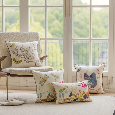 Coussin Brodé de Papillons, en Coton avec Bord Roulé