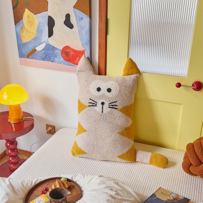 Le coussin MOELLO adopte une forme de chat immédiatement lisible, aux lignes simples et attachantes. Ses oreilles pointues, son visage aux traits doux et sa petite queue courte apportent une touche de fantaisie discrète, pleine de naïveté. L’ensemble évoque un chat paisible, posé là, qui invite naturellement à s’approcher et à le serrer contre soi. Les teintes chaleureuses de beige clair et de jaune miel renforcent cette sensation de douceur et de réconfort, créant une présence apaisante sur un lit ou un canapé, dans la chambre comme dans le salon.