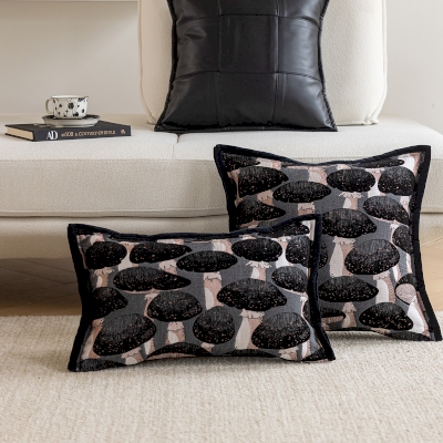 Coussin Nero, Jacquard à Motif Champignons et Passepoil Noir