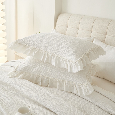 Ce couvre-lit ne se contente pas d’être uni : il est enrichi de motifs matelassés d’inspiration européenne, apportant une touche de sophistication classique. Sa bordure à volants ajoute une finition romantique et raffinée qui complète harmonieusement son design.