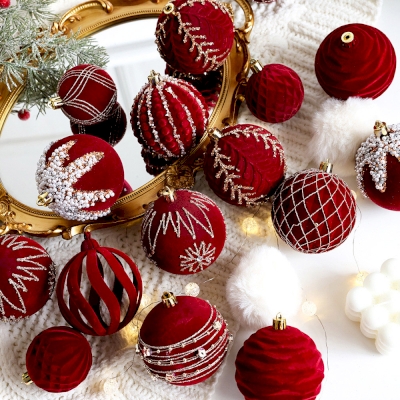 Sublimez votre décoration de Noël avec notre sélection exclusive de boules de Noël en velours et texturées. Cette collection, aux teintes de rouge somptueux, offre une esthétique riche et chaleureuse pour accueillir la saison des fêtes. Chaque boule est soigneusement conçue avec une variété de textures allant de motifs géométriques à des effets de neige délicatement flockés, ajoutant une dimension de sophistication à votre arbre de Noël.