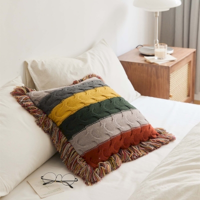 Housse de Coussin PATCHY, Patchwork Multicolore en Mélange Laine, Motif Tricot Torsadé, Finitions à Franges, 45 x 45 cm