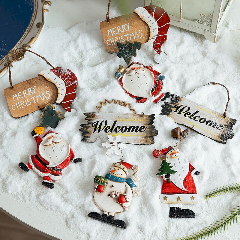 Le lot de 5 suspensions de Noël crée instantanément une atmosphère joyeuse et conviviale. Chaque pièce présente un Père Noël ou un bonhomme de neige tenant un petit panneau “Welcome” ou “Merry Christmas”. Leurs couleurs rouges, blanches et vertes, légèrement vieillies, rappellent le charme des décorations traditionnelles et apportent une note festive au sapin.