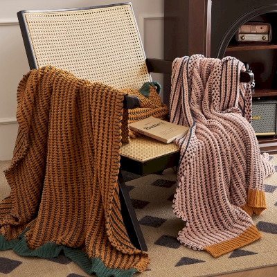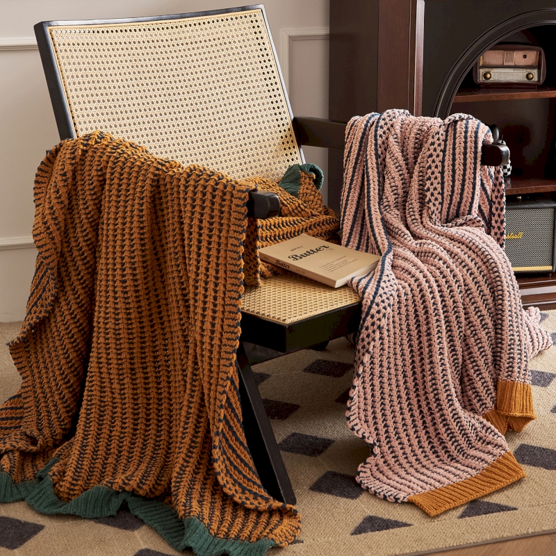 Plaid BRAMON, Tricot Chenille Bicolore, Finition Contrastée