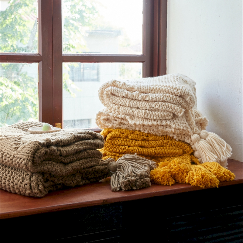 Tricoté en maille épaisse d’acrylique de haute qualité, il offre douceur et résistance. Les motifs torsadés et ajourés en losange apportent relief et élégance, tandis que les glands aux quatre coins ajoutent une touche bohème et raffinée. Certifié Oeko-Tex® Standard 100, il est garanti sans substances nocives pour un usage sûr au quotidien.