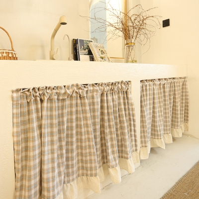 Accueil > Rideau Brise-Bise > Rideau Brise-bise à Carreaux Beige et Bleu avec Bord Inférieur Ondulé, Rideau Court, Rideau de Cuisine, Rideau Café, 1 Pièce