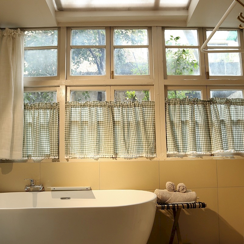 Accueil > Rideau Brise-Bise > Rideau Brise Bise plaid vert avec une boule de velours blanc, 1 Pièce Rideau Court