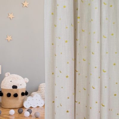 Rideau Enfantin en 100% Lin Pur, Brodé de Lunes et Étoiles
