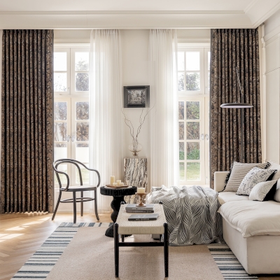 Éblouissant, le Rideau Étoilé en teintes noires et dorées, tissé avec maestria en jacquard aux effets détaillés, dévoile des motifs géométriques irréguliers, évoquant les étoiles scintillantes d'une nuit énigmatique.