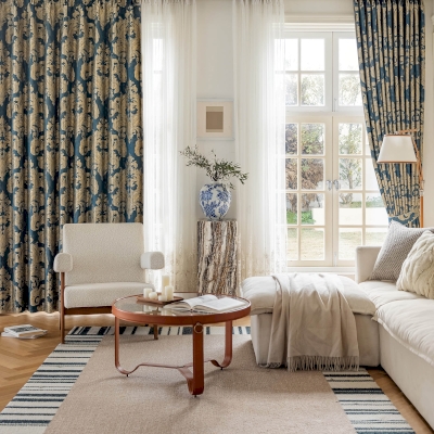 Les rideaux FLOR, créés par un designer de renom, sont des pièces sophistiquées et élégantes en jacquard dans la teinte exclusive "Saphir Doré". Cette nuance singulière marie la profondeur énigmatique du bleu saphir à l’éclat raffiné de l’or, révélant toute la richesse du motif en relief de feuilles de renoncule, signature du style FLOR.