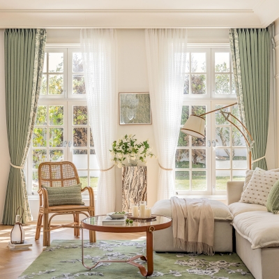 Combinant le motif classique de Toile de Jouy avec des rayures de couleur unie, ce rideau est plus moderne et plus simple que les rideaux traditionnels qui utilisent ce motif.