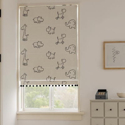 Découvrez le Store Bateau Occultant Sur Mesure en tissu avec une sensation de coton et lin, décoré de joyeux motifs d'animaux noir et blanc. Girafes rigolotes, éléphants joueurs et hippopotames espiègles animent ce tissu doux, apportant un univers plein de charme et de fantaisie à votre pièce. Les dessins simples et amusants créent un contraste adorable avec le fond naturel, transformant chaque fenêtre en une scène de conte pour enfants.