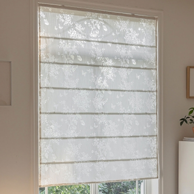 Le store bateau ÉLÉONORE se distingue par un tissu dévoré, dont les motifs floraux apparaissent en transparence, comme délicatement révélés par la lumière. Le procédé crée un contraste subtil entre matière et vide, donnant aux fleurs une présence aérienne et raffinée.
