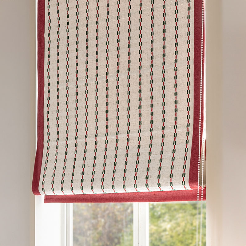 Le tissu offre une tenue souple mais présente, avec un léger relief perceptible au toucher. La bordure contrastée vient encadrer le motif et souligne la ligne du store avec précision, pour un rendu soigné et intemporel.