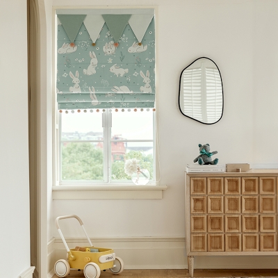 Émerveillez l'espace de jeu ou de repos de votre enfant avec notre store bateau en tissu chenille, créé sur-mesure pour s'adapter parfaitement à sa chambre. Ce rideau enchanteur est agrémenté de motifs sereins de lapins blancs, éparpillés sur un fond azur doux qui apporte une touche de quiétude à l'atmosphère. Des pompons soigneusement disposés en bordure ajoutent une texture amusante et un aspect ludique, capturant l'innocence et la joie de l'enfance.