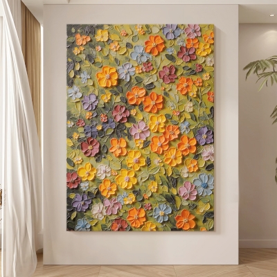 Tableau Décoratif BLOOM, Peinture à l’Huile en Relief Floral, Éclat de Fleurs en Pleine Floraison, Fait Main sur Mesure