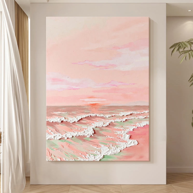 Tableau Décoratif ONIRIS, Peinture à l’Huile Texturée, Coucher de Soleil Marin Rose, Fait Main sur Mesure