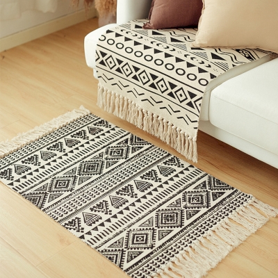 Tapis à Franges Noir et Blanc Tissé à La Main, 1 Pièce